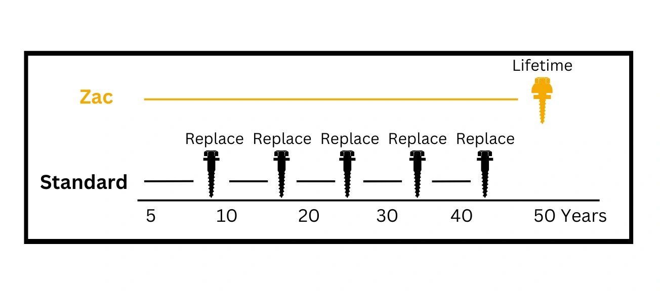 ZAC screws come with a umbrella cap head keeping the washer protected from the elements. Because of this, ZAC screws come with a lifetime warranty and do not need replacing. Standard screws have exposed washers which break down and need replacing every 7-10 years.